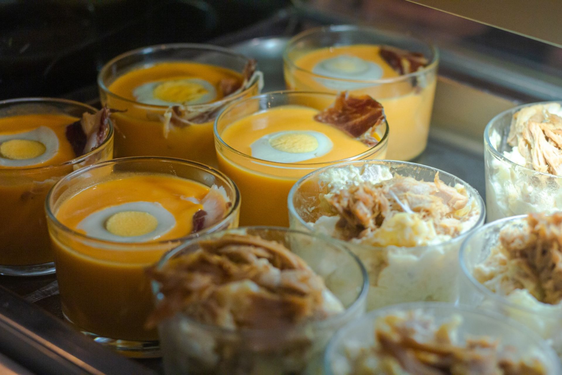 con una base de salmorejo, acompañada de calabacín, tomate, parmessano y tapenade de aceitunas negras